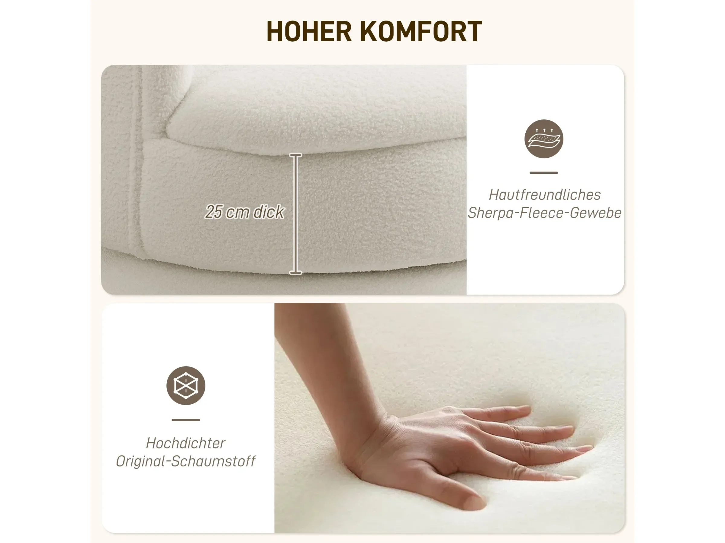 | Material | Sherpa (100 % Polyester), Schaumstoff, Kautschukholz |