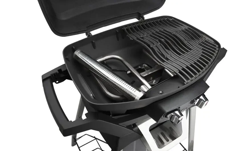 2 Edelstahlbrenner • 4,1 kW Gesamtleistung • WAVE™ Gusseisenroste • Hoher Aluguss-Deckel • Mobiles Untergestell mit Rädern
