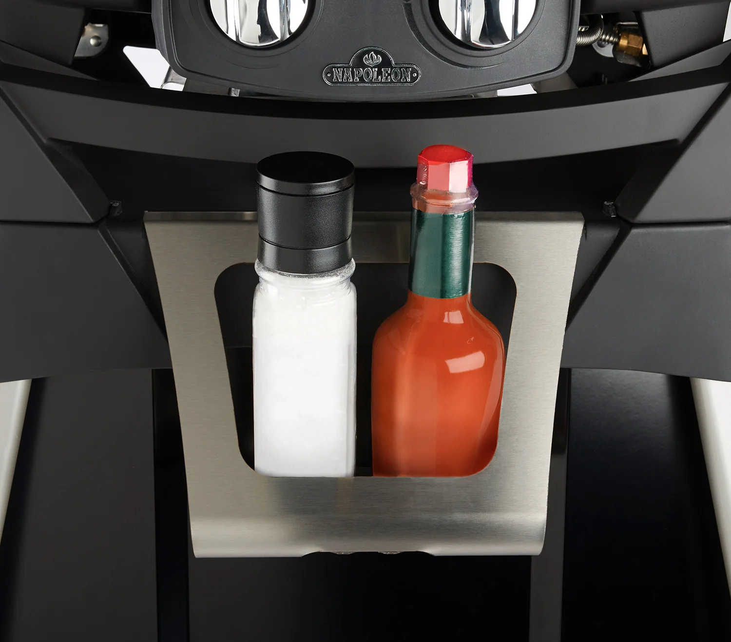 Highlights: Leichter, stabiler Unterwagen mit zwei großen Rädern, praktische Seitenablagen und 4 Besteckhaken, integriertes Gewürzregal und Flaschenöffner, Platz für 5‑kg‑Gasflasche hinter Frontabdeckung, hochwertige Materialien mit Edelstahl-Akzenten.